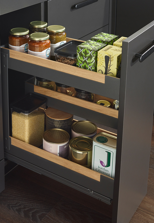 Opcjonalna dodatkowa półka umożliwia maksymalne wykorzystanie całej wysokości w szafce, a jej zamontowanie pozwala na skonfigurowanie systemu Pinello z trzema lub z czterema poziomami koszyków. Do zastosowania przy wyższych szafkach podblatowych, minimalne światło szafki to 720 mm.