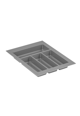 Organizer do szuflady na sztućce SCOOP z tworzywa z połyskiem w kolorze szarym o wymiarach szer. 840 mm x dł. 490 mm x wys. 60 mm to wygodny wkład do segregacji sztućców i różnych drobiazgów. Przeznaczony jest do umieszczenia wewnątrz szuflady w szafce kuchennej o szerokości frontu 900 mm i głębokości prowadnicy 500 mm. Pasuje do wszystkich rodzajów szuflad, a niezwykle ważną cechą jest to, że posiada po szerokości po około 20 mm oraz po długości po około 25 mm zapasu z możliwością przycięcia do pożądanych wymiarów, co pozwala na wykorzystanie go w szufladach przy niestandardowych szerokościach, można go w własnym zakresie dociąć maksymalnie do wymiarów 200 mm na szerokość i 440 mm na długości (nie świadczymy usług w zakresie docinania wkładu).