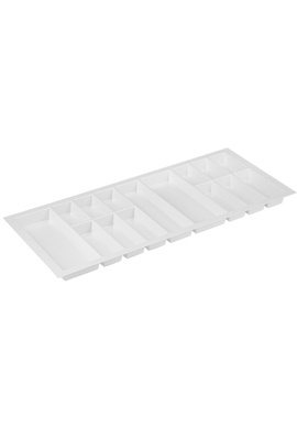 Wkład Classico na sztućce i akcesoria kuchenne w kolorze czarnym. Wkład pasuje do szuflad o szerokości frontu 900 mm i głębokości prowadnicy 500 mm. Wkład ma po szerokości i po długości szerszy zapas, który umożliwia samodzielne docięcie wkładu do niestandardowych wymiarów szafki z szufladami. Wkład do szuflady wykonany jest z bardzo dobrego jakościowo, wytrzymałego tworzywa sztucznego, bezzapachowego, o grubości 2 mm. Solidny, odporny na odkształcenia i pęknięcia, jest bardzo lekki. Jest łatwy do czyszczenia, gładka powierzchnia wkładu nie „przyjmuje brudu”, nie widać na niej smug czy zarysowań. Jest bardzo estetycznie wykonany i bardzo ładnie wygląda w każdej szufladzie nie tylko w nowoczesnych meblach ale również w szufladach bardziej tradycyjnych. Praktyczny wkład do szuflady pozwoli na utrzymanie porządku i szybkie odłożenie umytych sztućców na właściwe miejsce. Przy podanej szerokości do dyspozycji mamy 12 komór. Mniejsze komory posłużą do przechowywania łyżeczek, widelczyków czy innych drobnych akcesoriów np.: zaparzacza do herbaty, większe komory świetnie zorganizują przestrzeń na łyżki stołowe, noże i widelce, natomiast największa szeroka komora idealna będzie do dużych łyżek do mieszania potraw, szczypców, łopatek czy chochli. Wymiary wkładu: