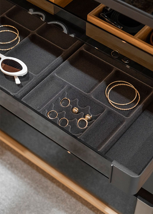Połączenie przejrzystego szkła z flokowym organizerem na biżuterię i pierścionki to gwarancja estetyki i praktyczności. Tego typu szuflady doskonale nadają się do przechowywania biżuterii, zegarków czy dodatków.