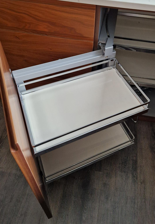 Dzięki Magic Corner ARENA Style użytkowanie szafki narożnej staje się wyjątkowo wygodne. Płynny i cichy ruch mechanizmu zapobiega przesuwaniu się przechowywanych przedmiotów, a solidne, prostokątne półki zapewniają optymalne wykorzystanie przestrzeni. Dodatkową zaletą systemu jest łatwość w utrzymaniu czystości – kosze można z łatwością zdjąć ze stelaża, co ułatwia ich czyszczenie. Hamulec SoftStopp zapewnia ciche i bezpieczne zamykanie szafki.