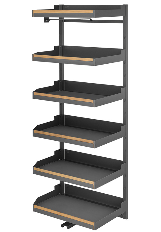 Pleno Maxi Standard doposażone z przodu w dębową drewnianą listwę, to funkcjonalny i solidny system wysuwanej spiżarni przeznaczony do wysokich szafek kuchennych z frontem 750 mm. Wersja Standard zapewnia sześć pojemnych, szerokich i głębokich półek, które idealnie nadają się do centralnego przechowywania zapasów spożywczych oraz zastawy stołowej. To rozwiązanie świetnie organizuje przestrzeń w kuchni, umożliwiając przechowywanie dużej ilości produktów w jednym miejscu.