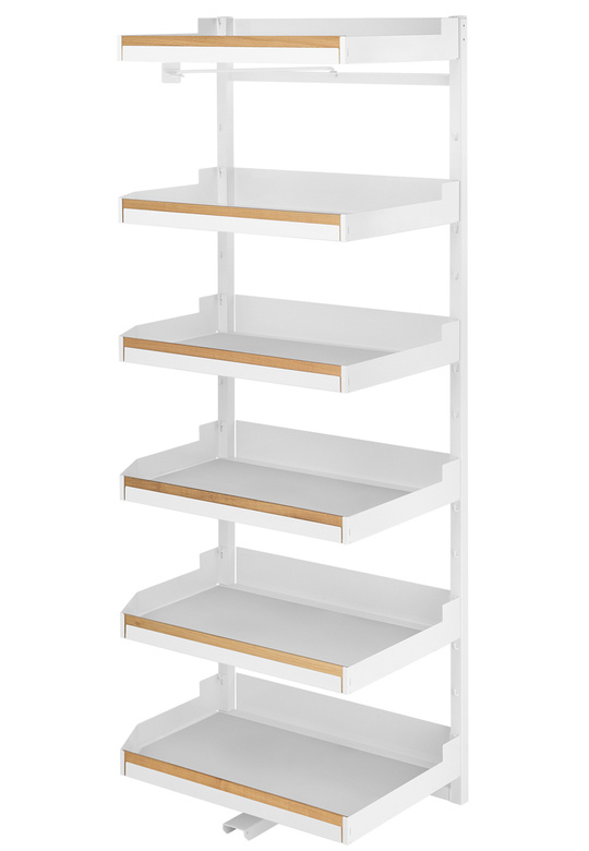 Pleno Maxi Standard doposażone z przodu w dębową drewnianą listwę, to funkcjonalny i solidny system wysuwanej spiżarni przeznaczony do wysokich szafek kuchennych z frontem 750 mm. Wersja Standard zapewnia sześć pojemnych, szerokich i głębokich półek, które idealnie nadają się do centralnego przechowywania zapasów spożywczych oraz zastawy stołowej. To rozwiązanie świetnie organizuje przestrzeń w kuchni, umożliwiając przechowywanie dużej ilości produktów w jednym miejscu.