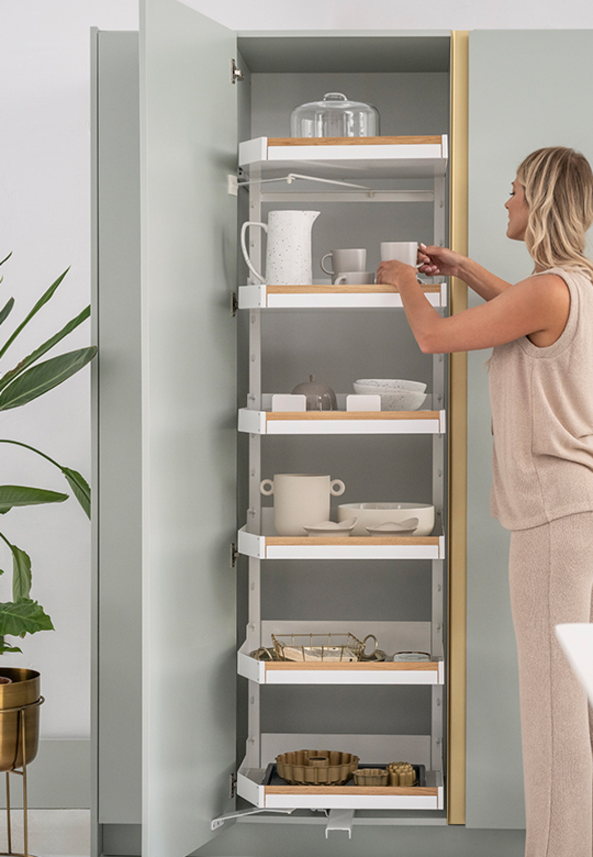 System maksymalnie wykorzystuje dostępną przestrzeń w szafce. Po otwarciu drzwi użytkownik otrzymuje pełny, przejrzysty widok na zawartość i natychmiastowy dostęp do każdej półki. Wysuwane kosze umożliwiają wygodne sięganie nawet do najdalszych zakamarków, znacznie podnosząc komfort codziennego użytkowania.
