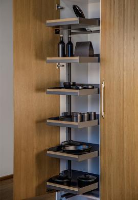 eTouch Mini - wspomaga wysunięcie carga z szafki na odległość około 30-40 mm i pozwala otwierać szafki z frontami bez uchwytów. Jednostkę podstawową eTouch można stosować od szerokości 300 mm i należy montować z prawej strony prowadnicy.