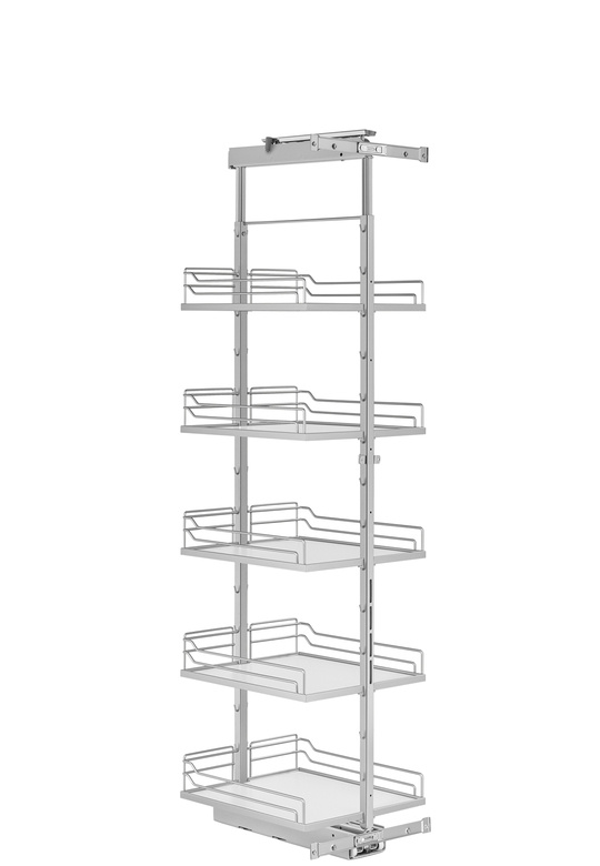 Cargo wysokie Dispensa do montażu w słupku meblowym do szerokości 450 mm. Ramę systemu mocujemy od wewnętrznej strony do frontu, natomiast prowadnicę dolną i górne prowadzenie do korpusu szafki. Po wysunięciu systemu z szafki mamy doskonały dostęp do przestrzeni magazynowej zarówno z jednej jaki i z drugiej strony. Cargo Dispensa 450 bez problemu pomieści duże ilości zapasów i pozwoli wygodnie je poukładać – jak w praktycznej, domowej spiżarni. A jeśli zaplanujesz rozkład szafek, tak aby cargo Dispensa, umieścić tuż obok lodówki, wówczas zgromadzone produkty suche będą w jednej strefie – nie będziesz już zbierać składników z różnych schowków, szafek i szuflad, wystarczy, że jednym ruchem wysuniesz całą zawartość szafki a wszystko będziesz mieć w zasięgu ręki. Dzięki temu funkcjonalnemu mechanizmowi Dispensa zyskujesz praktyczną przestrzeń na przechowywanie dużej ilości zapasów, a każda umieszczona rzecz jest doskonale widoczna i łatwa do zlokalizowania.