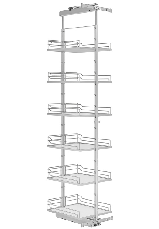 Cargo wysokie Dispensa do montażu w słupku meblowym do szerokości 450 mm. Ramę systemu mocujemy od wewnętrznej strony do frontu, natomiast prowadnicę dolną i górne prowadzenie do korpusu szafki. Po wysunięciu systemu z szafki mamy doskonały dostęp do przestrzeni magazynowej zarówno z jednej jaki i z drugiej strony. Cargo Dispensa 450 bez problemu pomieści duże ilości zapasów i pozwoli wygodnie je poukładać – jak w praktycznej, domowej spiżarni. A jeśli zaplanujesz rozkład szafek, tak aby cargo Dispensa, umieścić tuż obok lodówki, wówczas zgromadzone produkty suche będą w jednej strefie – nie będziesz już zbierać składników z różnych schowków, szafek i szuflad, wystarczy, że jednym ruchem wysuniesz całą zawartość szafki a wszystko będziesz mieć w zasięgu ręki. Dzięki temu funkcjonalnemu mechanizmowi Dispensa zyskujesz praktyczną przestrzeń na przechowywanie dużej ilości zapasów, a każda umieszczona rzecz jest doskonale widoczna i łatwa do zlokalizowania. System sprzedawany jest w linni ARENA Classic Silver- wykończenie okrągłymi malowanymi proszkowo relingami i drewnianym dnem pokrytym powłoką antypoślizgową RutschStopp. Rama systemu składa się z dwóch odcinków, dzięki czemu można ją swobodnie dopasować do przestrzeni szafki. Obsługiwany zakres światła szafki to 1900-2300 mm. Rama posiada wbudowane haczyki rozmieszczone co 10 cm wzdłuż całego dłuższego profilu. Takie rozwiązanie pozwala nam samemu decydować na jakiej wysokości zawiesimy koszyki. Pomimo, że rama rozciąga się około 400 mm, to ostatni haczyk jest na dolnym zakresie ramy. Przy maksymalnym rozciągnięciu ramy zalecane są przedłużki pozwalające zawiesić kosz w górnej części ramy (przedłużki o symbolu 01.440.02 – nie wchodzą w skład kompletu, do dodatkowego dokupienia). W systemie zastosowana jest prowadnica z pełnym wysuwem. Prowadnica posiada cichy domyk, dzięki niemu wysuwanie całego carga Dispensa jest płynne i stabilne. W celu optymalnego funkcjonowania systemu zaleca się zastosowanie hamulca Soft Stopp Pro 01.265.S, który wyhamuje cargo w momencie otwierania (hamulec nie wchodzi w skład kompletu, w razie potrzeby należy go dokupić osobno).