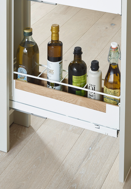 Przegroda na butelki i pojemniki dzieli półkę na 4 części, zmieniając zagraconą przestrzeń w strefę ładu i porządku. Przegroda chroni butelki i przyprawy o różnych rozmiarach przed upadkiem, zapewnia bezpieczne ich przechowywanie i wygodne użytkowanie szafki. Przegrodę na butelki montuje się łatwo i bez użycia narzędzi i można ją założyć w dowolnym momencie, nawet w gotowej szafce. Uchwyt na butelki zaleca się stosować na dolnej półce systemu.