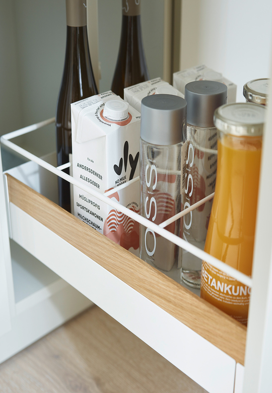 Przegroda na butelki i pojemniki dzieli półkę na 4 części, zmieniając zagraconą przestrzeń w strefę ładu i porządku. Przegroda chroni butelki i przyprawy o różnych rozmiarach przed upadkiem, zapewnia bezpieczne ich przechowywanie i wygodne użytkowanie szafki. Przegrodę na butelki montuje się łatwo i bez użycia narzędzi i można ją założyć w dowolnym momencie, nawet w gotowej szafce. Uchwyt na butelki zaleca się stosować na dolnej półce systemu.