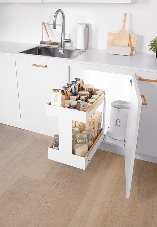 To rozwiązanie stworzone z myślą uzupełnieniu szafki w zabudowie kuchennej, o szerokości jednego frontu od około 32 cm lub dwóch frontów nawet do 90 cm. Nadaje się do butelek, puszek, małych przedmiotów kuchennych. Doskonale sprawdzi się do przechowywania karmy dla pupili – wszystko schludnie, w jednym miejscu i zawsze pod ręką. Szczególnie dobrze sprawdzi się obok filtrów, młynków czy urządzeń do uzdatniania wody.