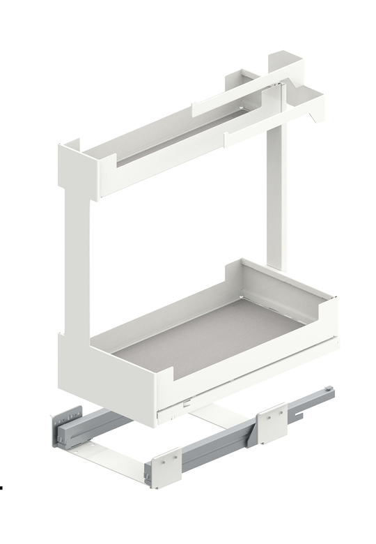 W komplecie znajduje się jednoczęściowy stelaż z precyzyjnymi prowadnicami zapewniającymi stabilny, równoległy ruch oraz silikonowe maty antypoślizgowe, które chronią półki i zapobiegają przesuwaniu przechowywanych akcesoriów. System dostępny jest w klasycznym kolorze białym, dopasowanym do nowoczesnych zabudów kuchennych.