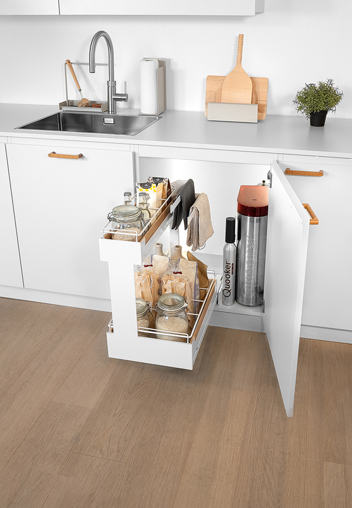 Ręczniki kuchenne mogą swobodnie wysychać, pozostając schowane i niewidoczne na pierwszy rzut oka, a dwie pojemne półki oferują miejsce na środki czystości, tabletki do zmywarki, nabłyszczacze, płyny dezynfekujące, szczoteczki, naboje CO₂ do systemów takich jak Quooker czy filtry do wody.
