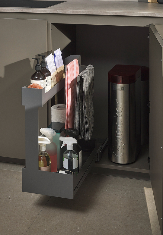 Ręczniki kuchenne mogą swobodnie wysychać, pozostając schowane i niewidoczne na pierwszy rzut oka, a dwie pojemne półki oferują miejsce na środki czystości, tabletki do zmywarki, nabłyszczacze, płyny dezynfekujące, szczoteczki, naboje CO₂ do systemów takich jak Quooker czy filtry do wody.