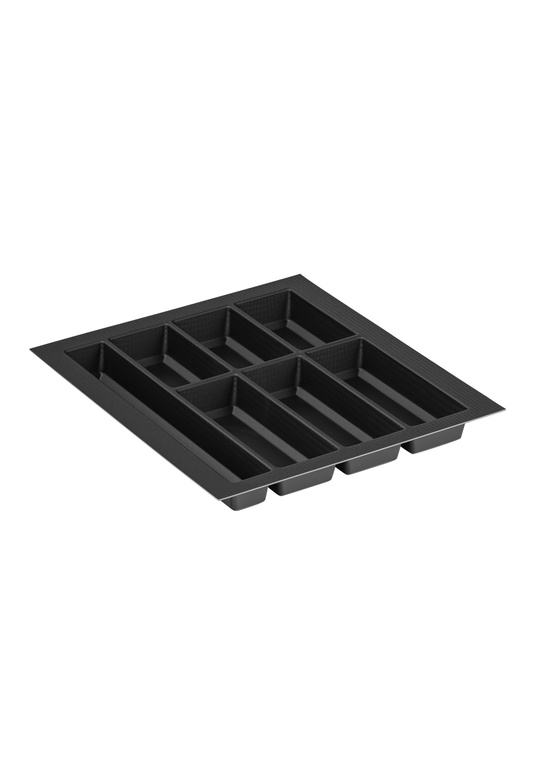 Wkład Classico na sztućce i akcesoria kuchenne w kolorze czarnym. Wkład pasuje do szuflad o szerokości frontu 500 mm i głębokości prowadnicy 500 mm. Wkład ma po szerokości i po długości szerszy zapas, który umożliwia samodzielne docięcie wkładu do niestandardowych wymiarów szafki z szufladami. Wkład do szuflady wykonany jest z bardzo dobrego jakościowo, wytrzymałego tworzywa sztucznego, bezzapachowego, o grubości 2 mm. Solidny, odporny na odkształcenia i pęknięcia, jest bardzo lekki. Jest łatwy do czyszczenia, gładka powierzchnia wkładu nie „przyjmuje brudu”, nie widać na niej smug czy zarysowań. Jest bardzo estetycznie wykonany i bardzo ładnie wygląda w każdej szufladzie nie tylko w nowoczesnych meblach ale również w szufladach bardziej tradycyjnych. Praktyczny wkład do szuflady pozwoli na utrzymanie porządku i szybkie odłożenie umytych sztućców na właściwe miejsce. Przy podanej szerokości do dyspozycji mamy 7 komór. Trzy mniejsze komory posłużą do przechowywania łyżeczek, widelczyków czy innych drobnych akcesoriów np.: zaparzacza do herbaty, trzy większe komory świetnie zorganizują przestrzeń na łyżki stołowe, noże i widelce. Wymiary wkładu: