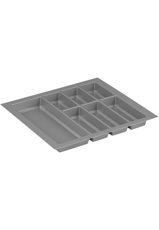 Wkład Classico na sztućce i akcesoria kuchenne w kolorze szarym. Wkład pasuje do szuflad o szerokości frontu 600 mm i głębokości prowadnicy 500 mm. Wkład ma po szerokości i po długości szerszy zapas, który umożliwia samodzielne docięcie wkładu do niestandardowych wymiarów szafki z szufladami. Wkład do szuflady wykonany jest z bardzo dobrego jakościowo, wytrzymałego tworzywa sztucznego, bezzapachowego, o grubości 2 mm. Solidny, odporny na odkształcenia i pęknięcia, jest bardzo lekki. Jest łatwy do czyszczenia, gładka powierzchnia wkładu nie „przyjmuje brudu”, nie widać na niej smug czy zarysowań. Jest bardzo estetycznie wykonany i bardzo ładnie wygląda w każdej szufladzie nie tylko w nowoczesnych meblach ale również w szufladach bardziej tradycyjnych. Praktyczny wkład do szuflady pozwoli na utrzymanie porządku i szybkie odłożenie umytych sztućców na właściwe miejsce. Przy podanej szerokości do dyspozycji mam 7 komór. Trzy mniejsze komory posłużą do przechowywania łyżeczek, widelczyków czy innych drobnych akcesoriów np.: zaparzacza do herbaty, trzy większe komory świetnie zorganizują przestrzeń na łyżki stołowe, noże i widelce, natomiast największa szeroka komora idealna będzie do dużych łyżek do mieszania potraw, szczypców, łopatek czy chochli. Wymiary wkładu: