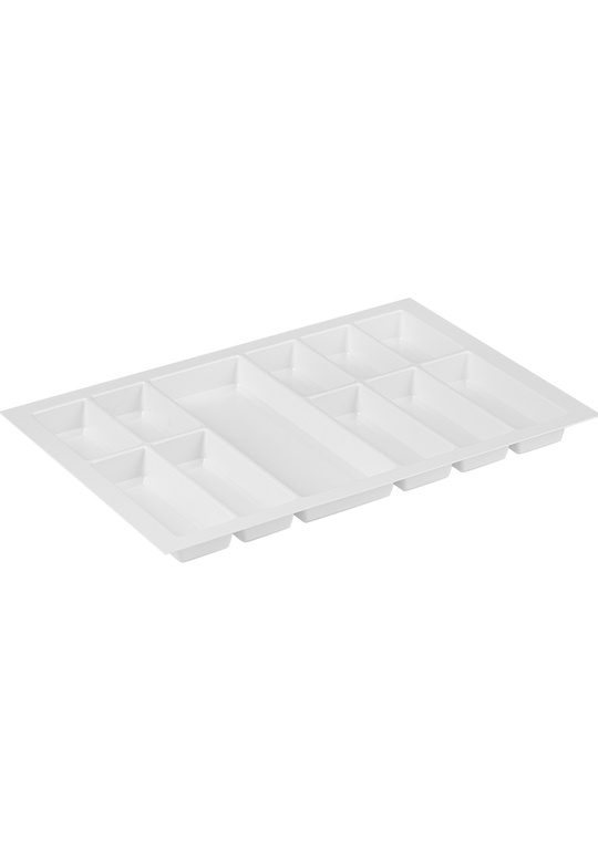 Wkład Classico na sztućce i akcesoria kuchenne w kolorze białym. Wkład pasuje do szuflad o szerokości frontu 800 mm i głębokości prowadnicy 500 mm. Wkład ma po szerokości i po długości szerszy zapas, który umożliwia samodzielne docięcie wkładu do niestandardowych wymiarów szafki z szufladami. Wkład do szuflady wykonany jest z bardzo dobrego jakościowo, wytrzymałego tworzywa sztucznego, bezzapachowego, o grubości 2 mm. Solidny, odporny na odkształcenia i pęknięcia, jest bardzo lekki. Jest łatwy do czyszczenia, gładka powierzchnia wkładu nie „przyjmuje brudu”, nie widać na niej smug czy zarysowań. Jest bardzo estetycznie wykonany i bardzo ładnie wygląda w każdej szufladzie nie tylko w nowoczesnych meblach ale również w szufladach bardziej tradycyjnych. Praktyczny wkład do szuflady pozwoli na utrzymanie porządku i szybkie odłożenie umytych sztućców na właściwe miejsce. Przy podanej szerokości do dyspozycji mamy 11 komór. Mniejsze komory posłużą do przechowywania łyżeczek, widelczyków czy innych drobnych akcesoriów np.: zaparzacza do herbaty, większe komory świetnie zorganizują przestrzeń na łyżki stołowe, noże i widelce, natomiast największa szeroka komora idealna będzie do dużych łyżek do mieszania potraw, szczypców, łopatek czy chochli. Wymiary wkładu: