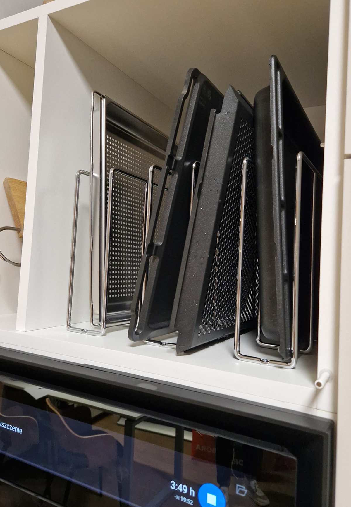 Uchwyt - stojak na deski i blachy to praktyczne rozwiązanie, które pozwala na efektywne wykorzystanie przestrzeni w kuchni. Uchwyt umożliwia przejrzyste przechowywanie tacek i desek, które zawsze będą w zasięgu ręki.