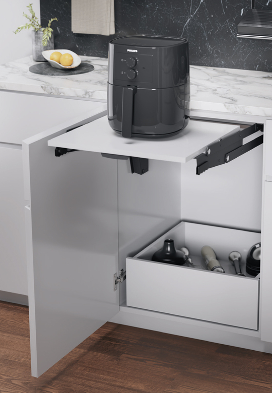 Mechanizm Chesf Table łatwo integruje się w istniejącej zabudowie kuchennej, jest przeznaczony do dolnych szafek z frontem na zawiasach i umożliwia wygodną pracę bezpośrednio na wysuniętym blacie. CHEFS Table to komfort i bezpieczeństwo. Amortyzowany mechanizm samodomykania zapewnia ciche i płynne wysuwanie, obsługa dwuręczna chroni przed przypadkowym odblokowaniem okucia, a po zakończeniu pracy blat można łatwo schować z powrotem do szafki.
