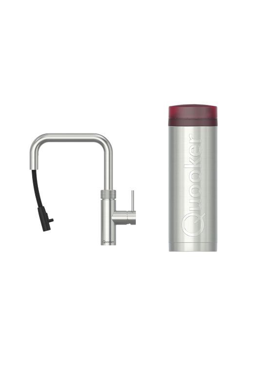 Zestaw Quooker Flex Square PRO3 to inteligentny kran z wrzątkiem, który łączy funkcję tradycyjnego kranu z kompaktowym bojlerem. Z jednego źródła możesz korzystać z wrzącej wody (100°C), ciepłej i zimnej wody - zawsze wtedy, gdy jej potrzebujesz.
