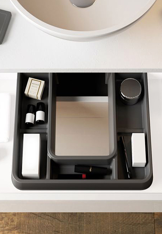 ONDA Line - wkład do szuflady umywalkowej jest to praktyczny element wyposażenia szuflady, który pozwala na wygodne rozmieszczenie kosmetyków, akcesoriów i środków higienicznych. Specjalnie zaprojektowany kształt umożliwia dopasowanie do wycięcia na syfon, maksymalnie wykorzystując dostępną przestrzeń.