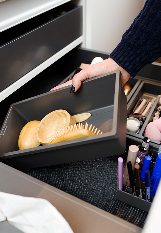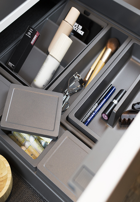 Organizer ONDA Line – funkcjonalny zestaw pudełek do przechowywania kosmetyków do pielęgnacji i makijażu. Dzięki kompaktowym wymiarom pojemniki doskonale pasują do łazienkowych szuflad o głębokości 40 cm, jednocześnie oferując dużą przestrzeń na różnorodne produkty.