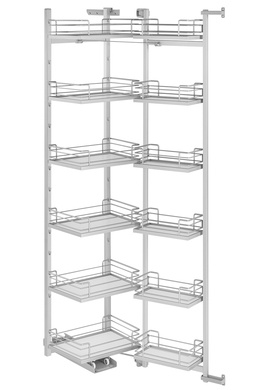 Nasze półki nadają się do wnętrza kuchennych szafek wysokich i niskich, montowanych po kilka półek w jednej przestrzeni, ale również jako pojedyncza półka, rewelacyjnie dopasowując się do każdej kuchennej spiżarni czy skrytki, szafy garderobianej czy gospodarczej. Półki Extendo Liro pasują do standardowych drzwi skrzydłowych lub przesuwnych, genialnie komponują się w szafkach z roletami a otwartym meblom nadają stylu i szyku.