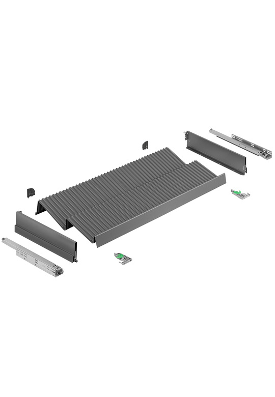 Wkład na buty w zestawie z szufladą Nova Pro Scala. Zestaw składa się z perforowanej wytłoczki w kształcie leżącej, podwójnej litery "Z", szuflady w skład której wchodzi komplet prowadnic Nova Pro z wyhamowaniem olejowym o pełnym wysuwie wraz z systemem cichego domyku Soft-Close, o długości znamionowej 500 mm i obciążeniu 40 kg, stalowe boki szuflady o wysokości 122 mm oraz komplet mocowań do frontu (dno i ściankę tylną szuflady należy dorobić w własnym zakresie).